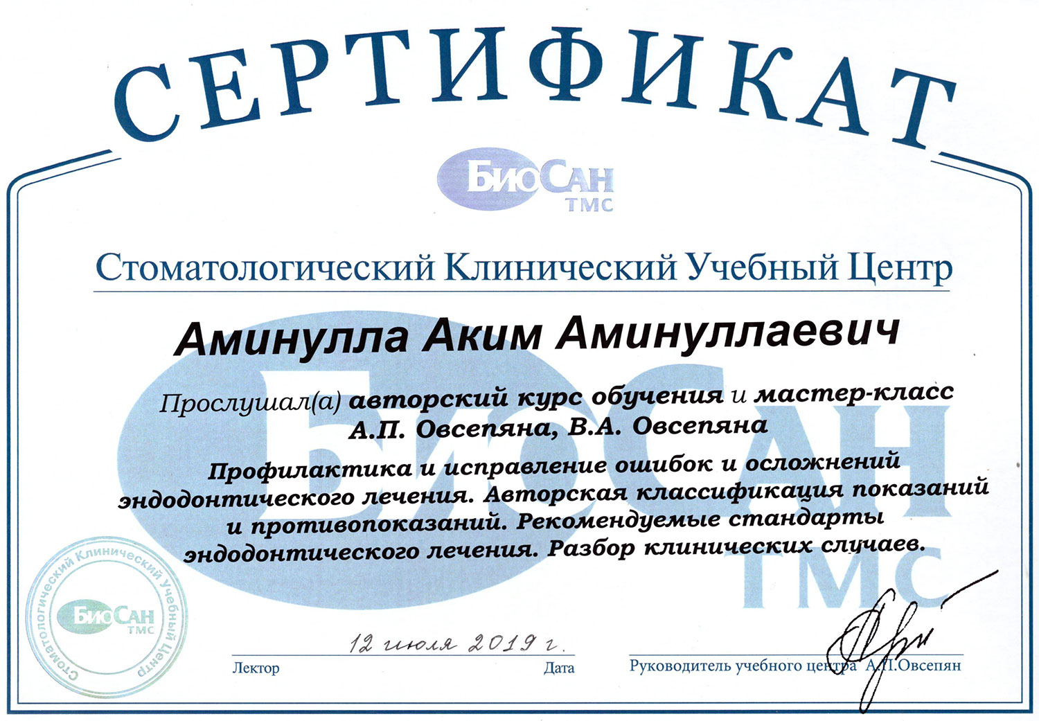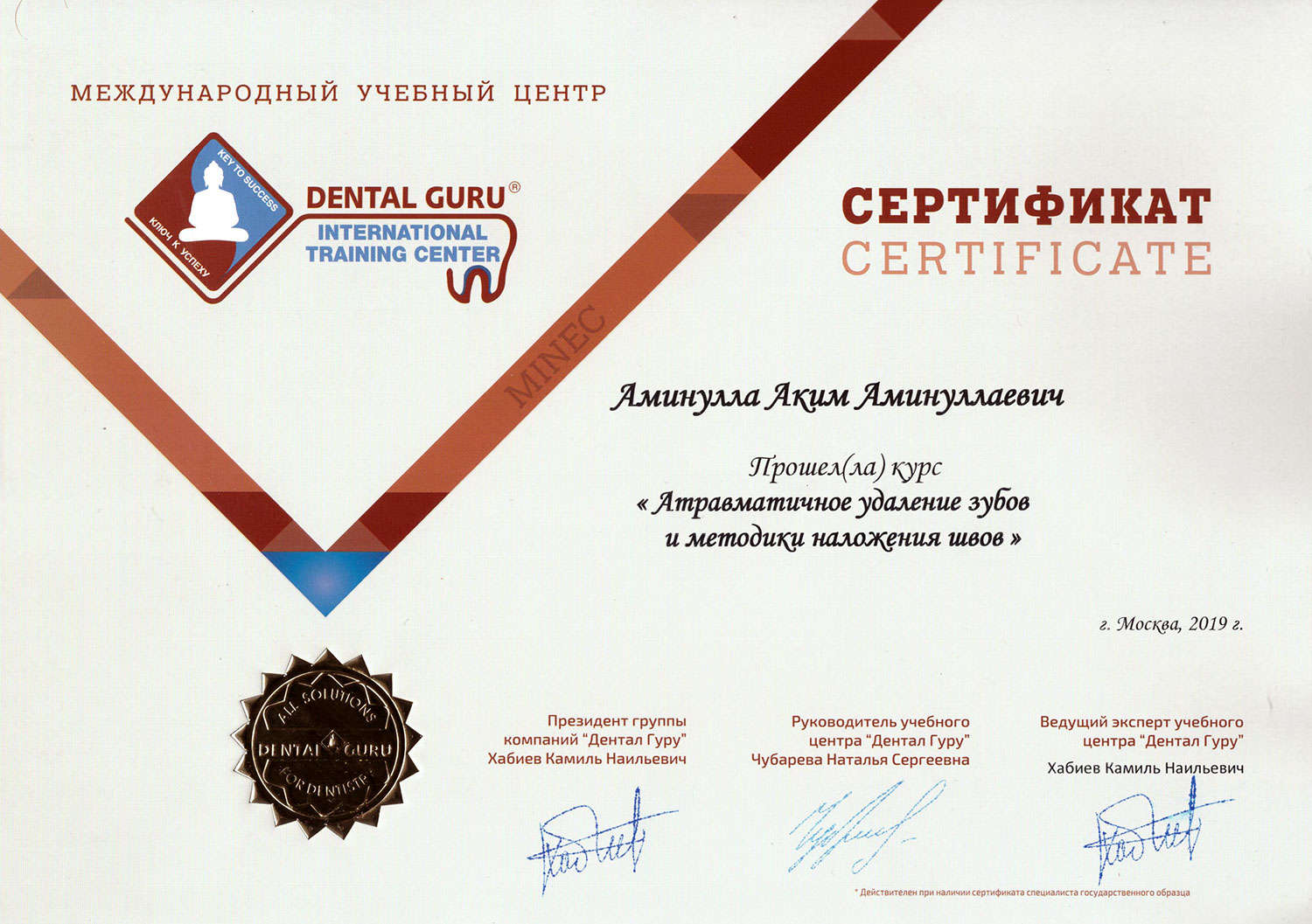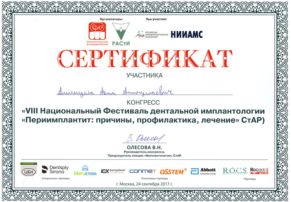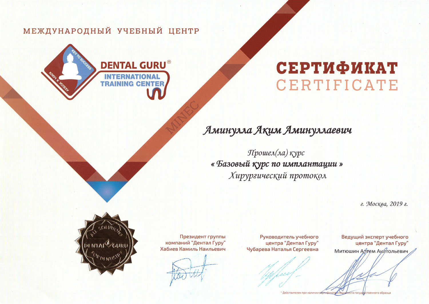 • 2019 - «Базовый курс по имплантации», Международный учебный центр «Dental Guru»