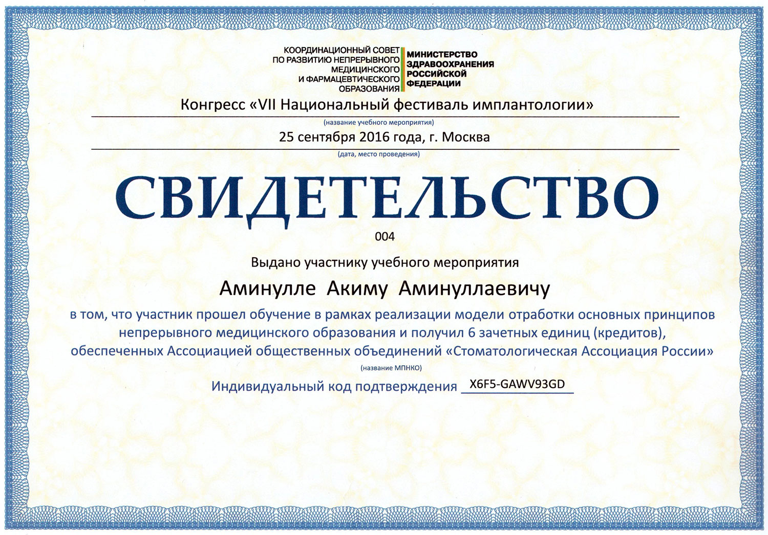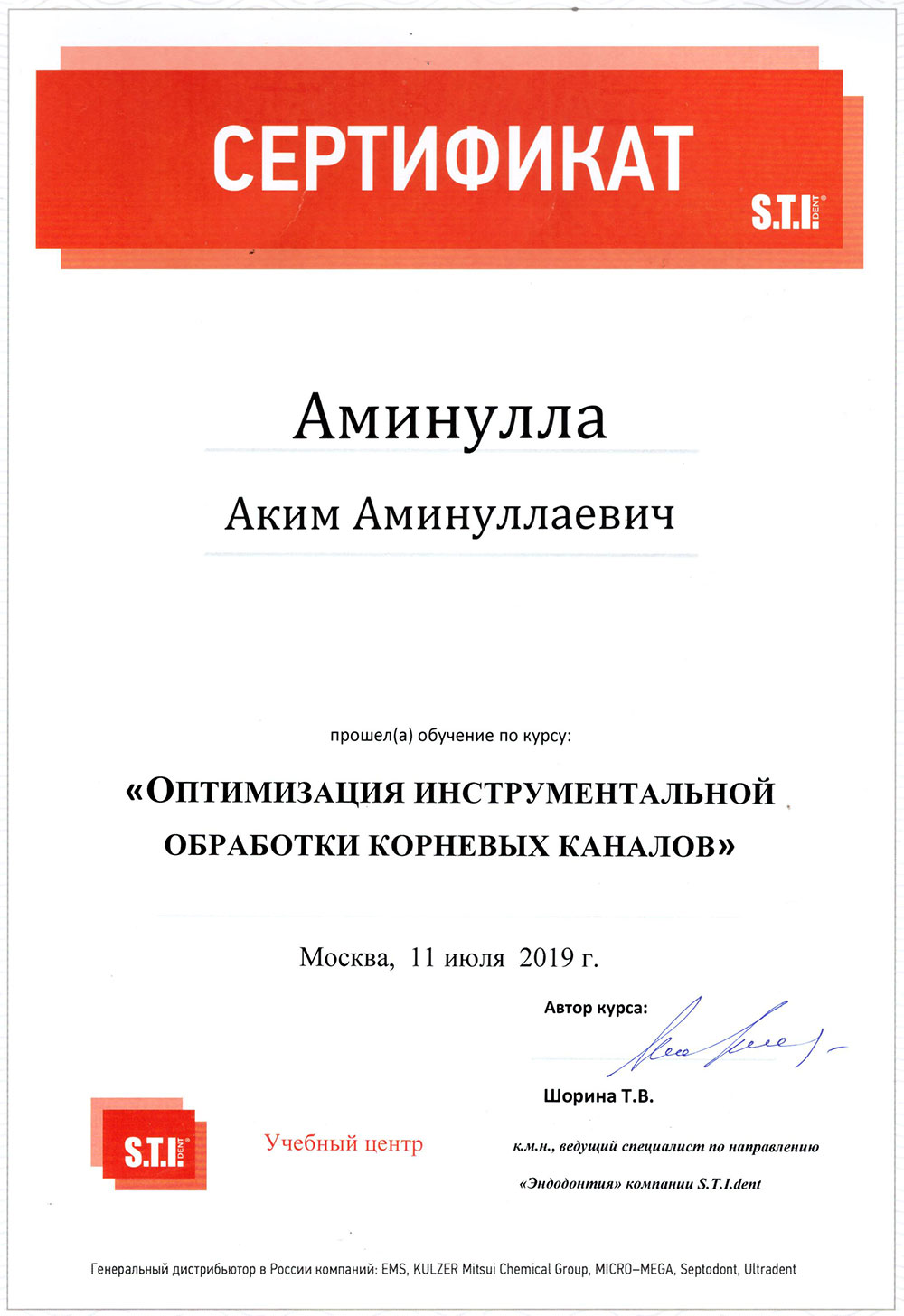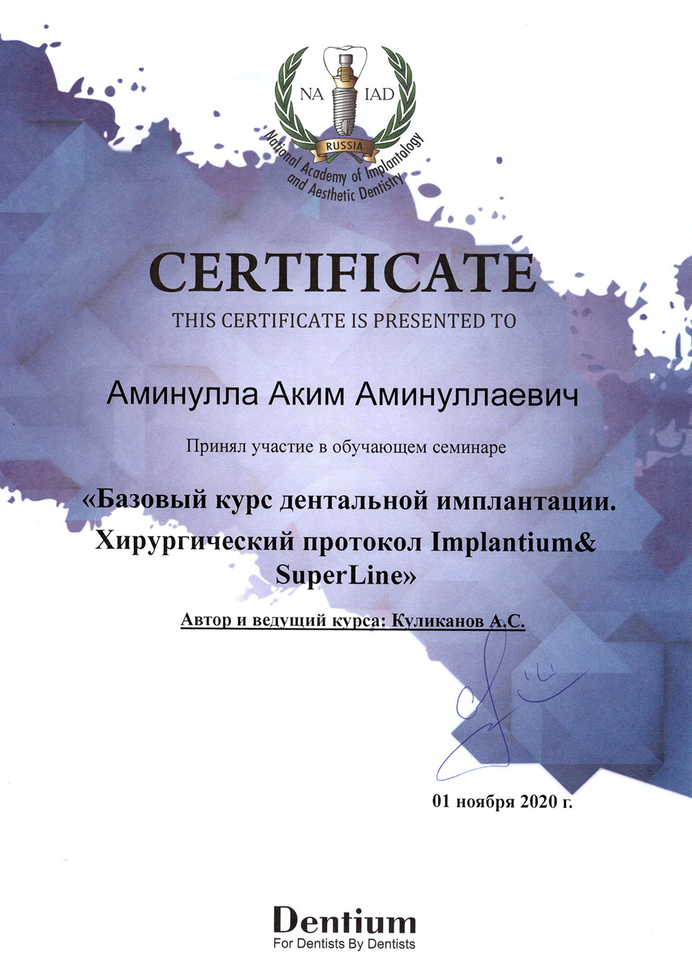 • 2019 - «Базовый курс по имплантации», Международный учебный центр «Dental Guru»