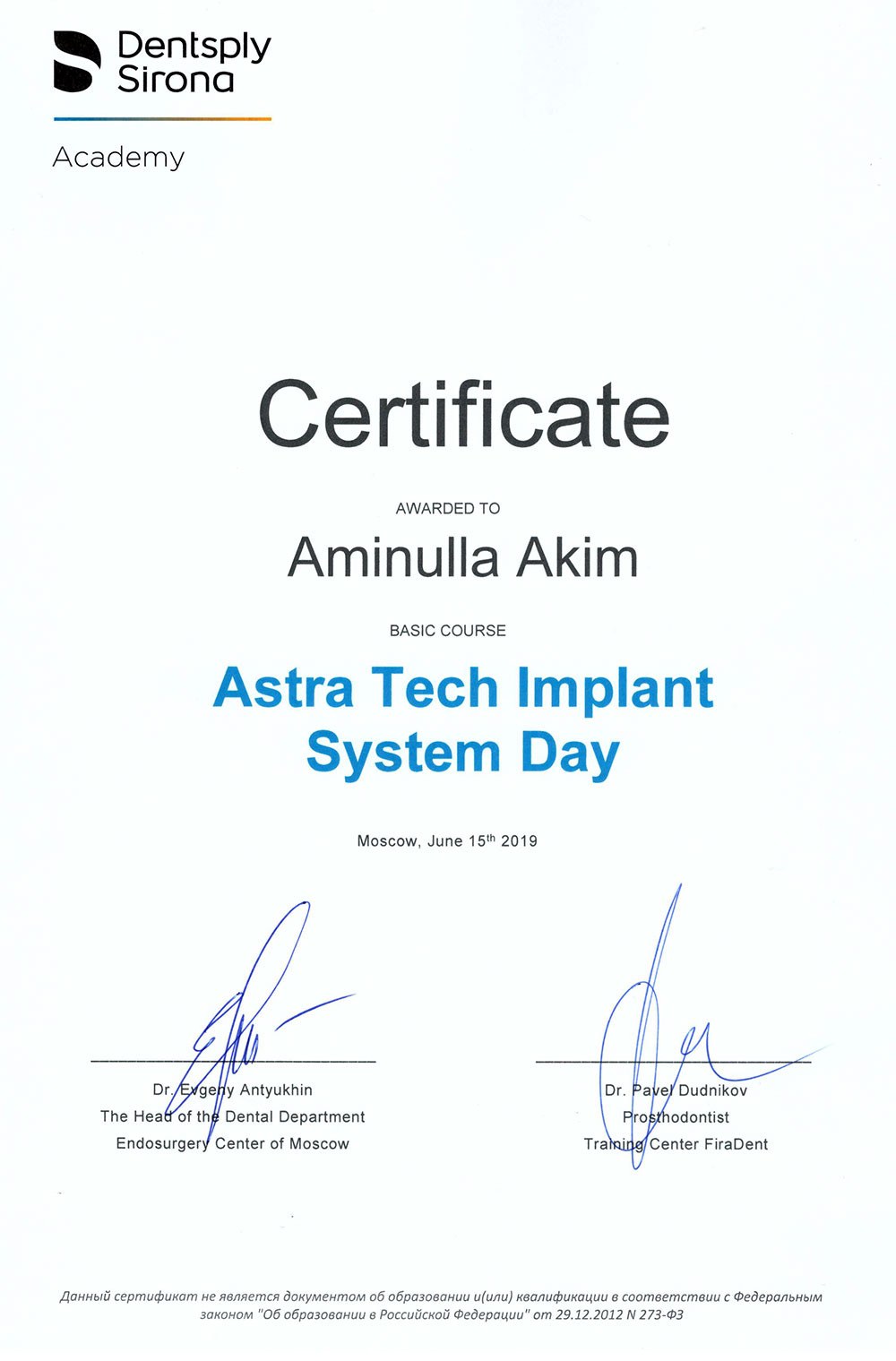 • 2019 - «Работа с имплантационной системой Astra Tech Implant»