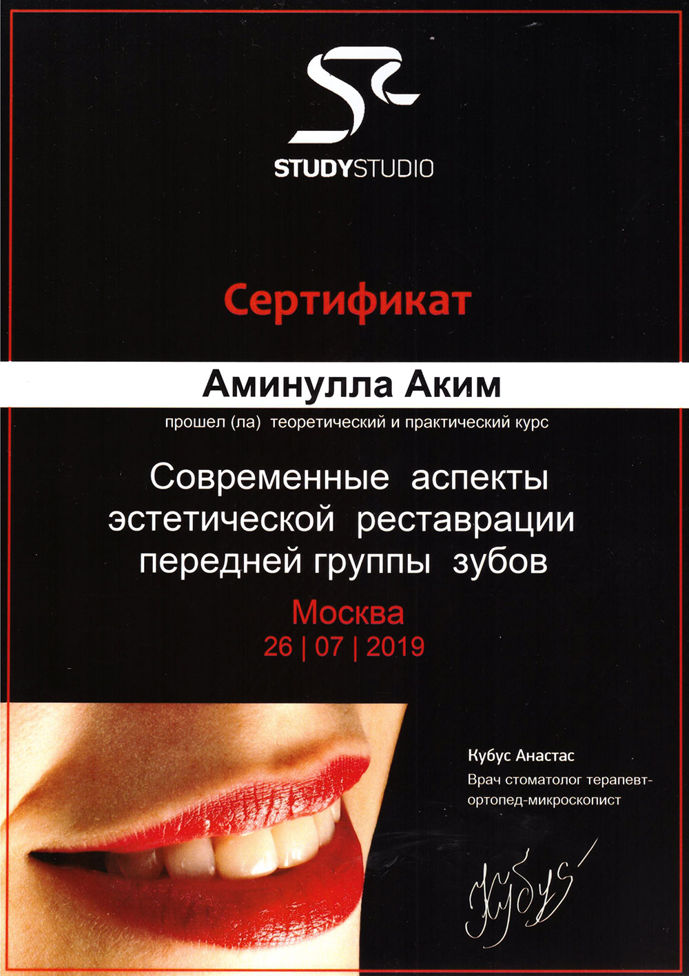 • 2023 - «Эстетическая реабилитация травматических повреждений постоянных зубов», Учебный центр S.T.I. Dent