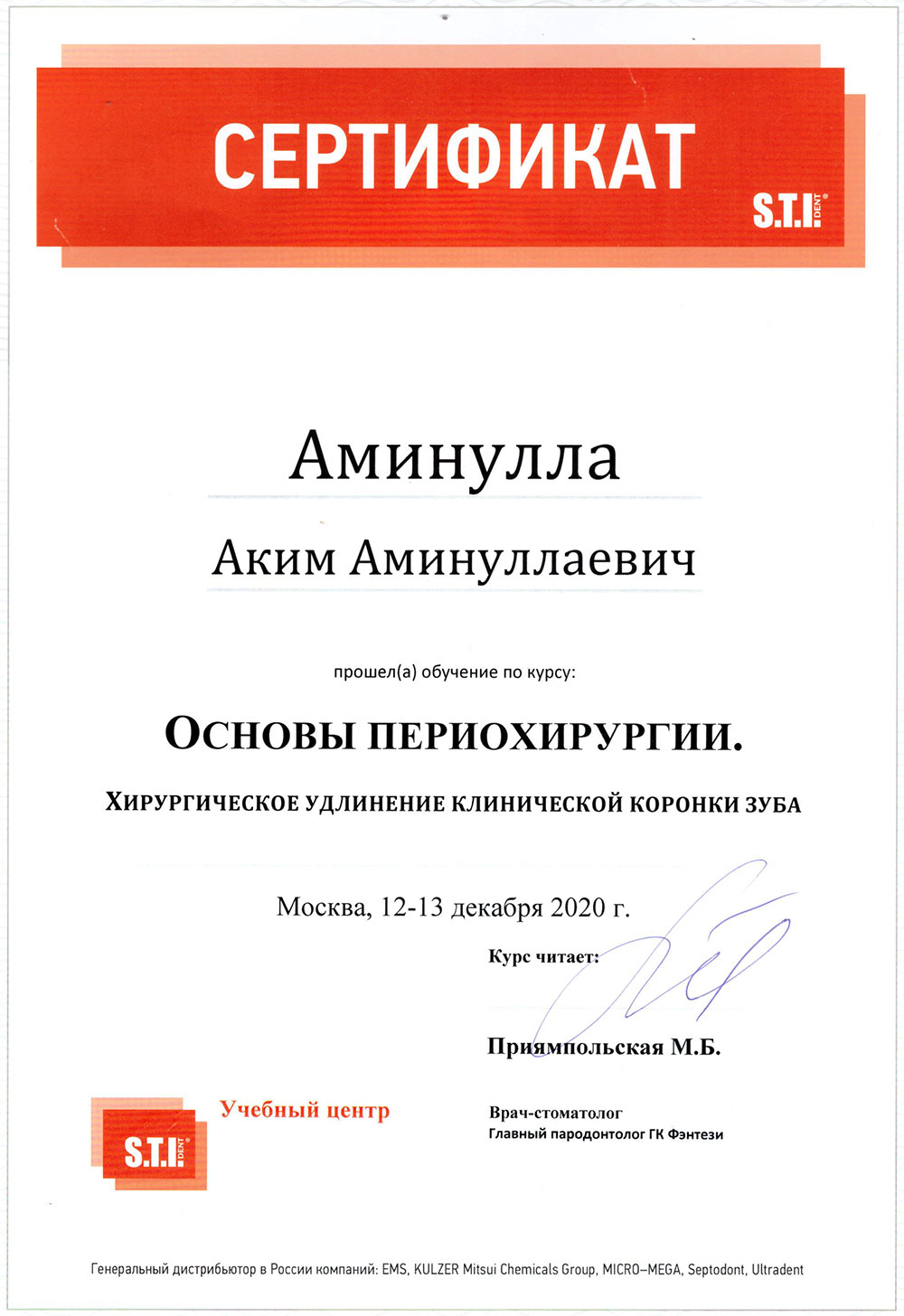 • 2020 - «Основы периохирургии. Хирургическое удлинение клинической коронки зуба», Учебный центр S.T.I. Dent
