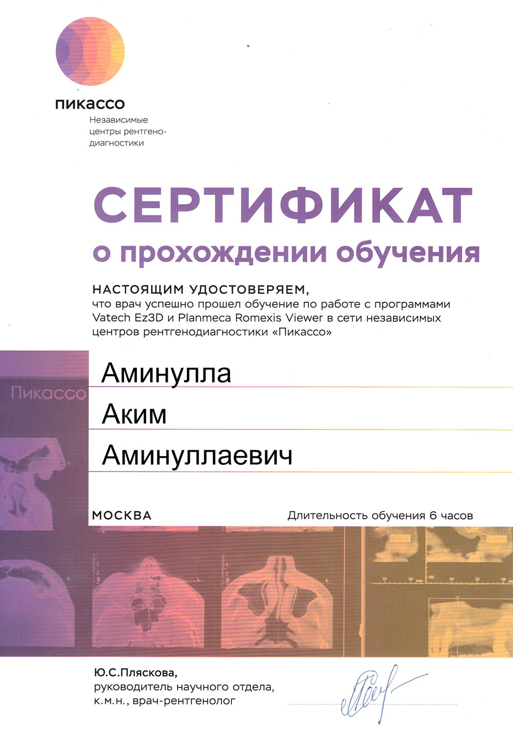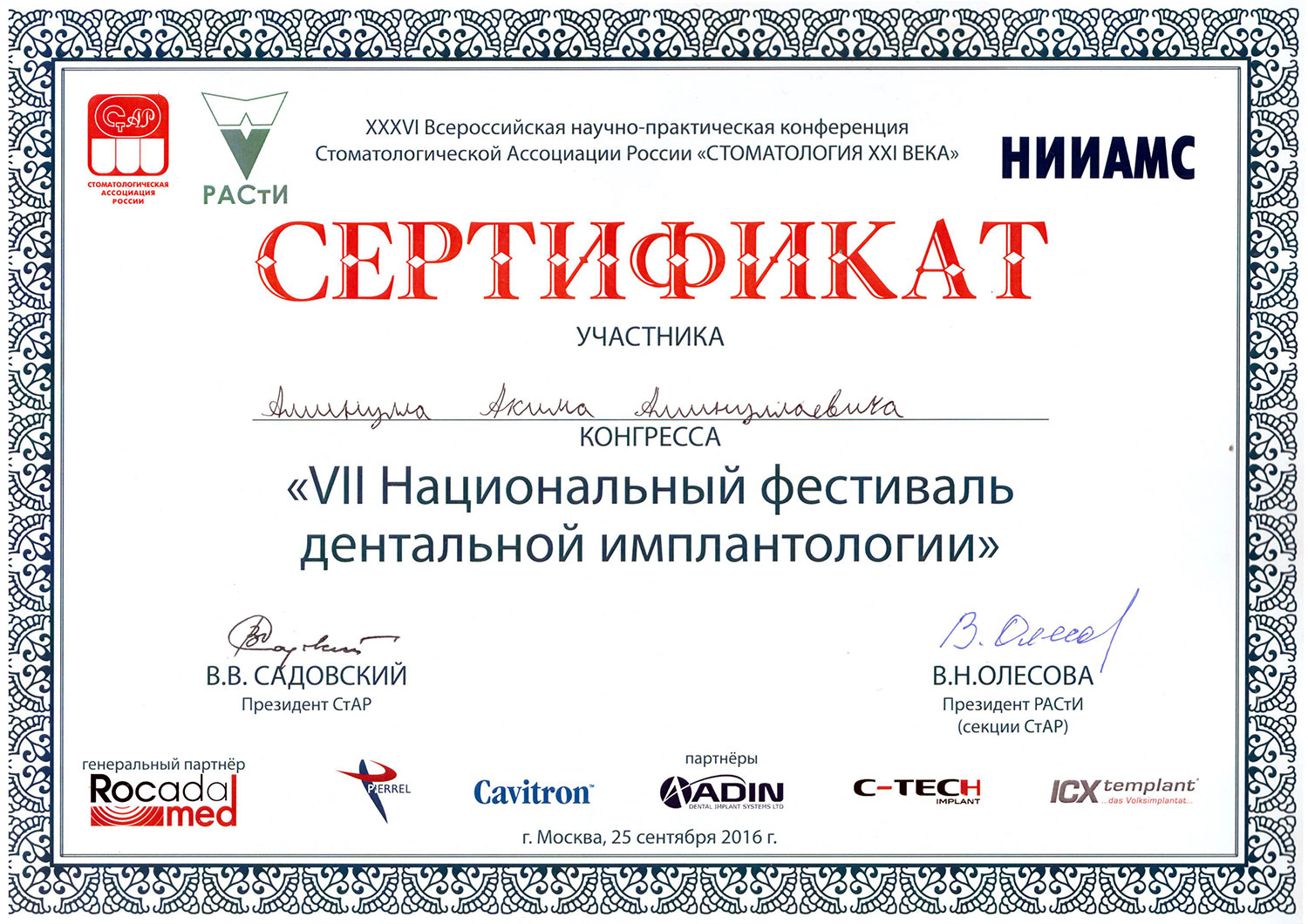 2016 – ординатура по специальности Стоматология хирургическая» в РНИМУ им. Н.И. Пирогова.